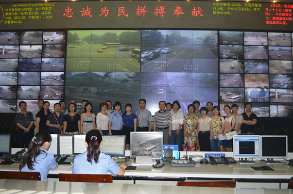 接著大家來(lái)到鐫刻有“忠誠(chéng)為民、拼搏奉獻(xiàn)”字樣的全市交通路況顯示屏前。大屏幕上顯示著鄭州市各個(gè)主要單位、部位和重要道路交叉路口的即時(shí)信息,具有GPS定位功能的警車在不停地移動(dòng),視頻畫(huà)面依序切換,“原來(lái)每時(shí)每刻都有幾百輛警車在街面巡邏,每個(gè)路口都有監(jiān)控。看樣子,鄭州市的安保工作還是有保障的,以后更要規(guī)范自己的言行,遵守交通規(guī)則”大家很是感慨。