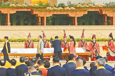 祈福中華。拜祖臺上,一幅波濤壯闊的黃河畫卷徐徐展開。古小玉、何新、劉家強、符之冠、陸進、徐顯明、孫達,中央統戰部九局二級巡視員孫彥濤,國家文化和旅游部一級巡視員王鶴云,中國工程院院士、全國勘察設計大師何鏡堂,中國工程院院士、第二屆國醫大師王琦,中國工程院院士、華東合成生物產業技術研究院負責人鄭裕國,全國政協委員、北京大學教授張頤武,中國文聯書記處原書記、中國電影家協會分黨組原書記張宏,中國美術家協會分黨組書記、中國美術家協會副主席馬鋒輝,中國戲劇家協會分黨組書記、駐會副主席陳涌泉,中國食品藥品企業質量安全促進會會長毛振賓,國學專家、講席教授、北京中醫藥大學國學院創院院長張其成,知名學者、浙江大學求是特聘教授鄭強,資深媒體專家胡錫進,中歐經濟文化研究發展中心會長柯海嘯,中國男高音歌唱家、河南音樂學院院長戴玉強,河南鄧亞萍體育產業投資基金董事長鄧亞萍,全國政協委員、知名作家蔣勝男,首屆岐黃學者、河南中醫藥大學校長王耀獻,全國人大代表、依文集團董事長夏華,同仁堂集團董事長王貴平,香港中資基金業協會會長連少冬,中鐵工程裝備集團有限公司董事長趙華,國家級非物質文化遺產石雕項目代表性傳承人劉紅立,在畫卷上蓋印,以黃河為證,祝福國家安泰、海宇寧謐。