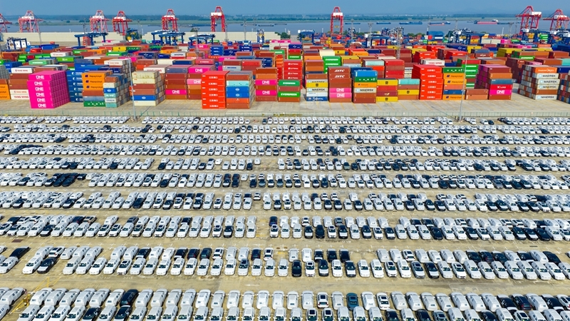 2025年10月4日在江蘇省港口集團(tuán)南京港龍?zhí)陡蹍^(qū)拍攝的準(zhǔn)備裝船出口的汽車(無人機(jī)照片)。新華社發(fā)(楊素平?攝)